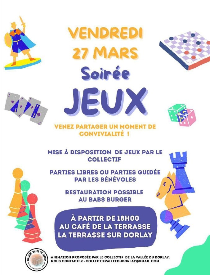 Dans le cadre du collectif de la Vallée du Dorlay, qui réunit des habitants de St Paul en Jarez, La Terrasse-sur-Dorlay et Doizieux, nous organisons régulièrement des événements "Rencontres et jeux". Une soirée est prévue au Café de La Terrasse, le vendredi 27 mars dès 18h. Venez nombreux !